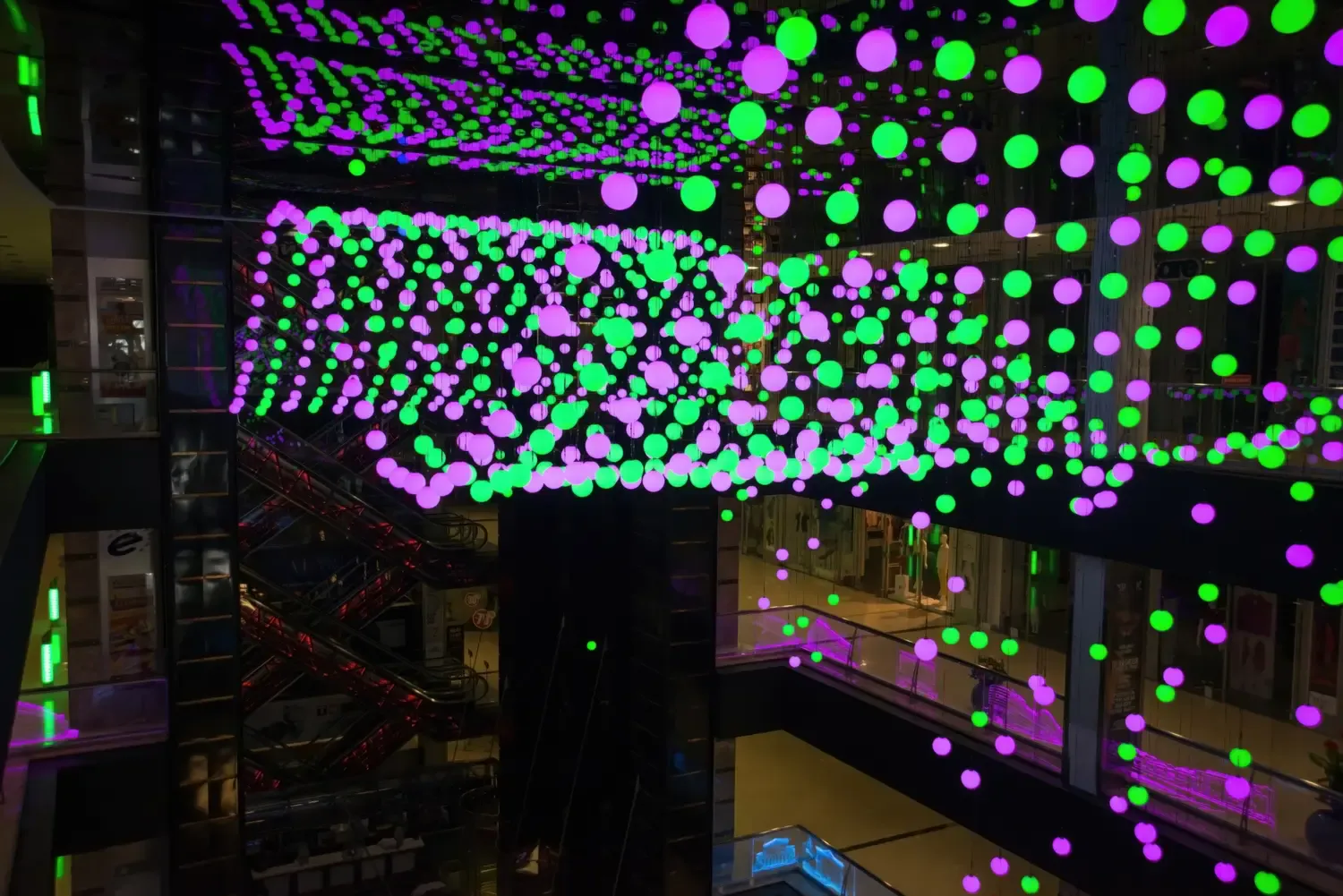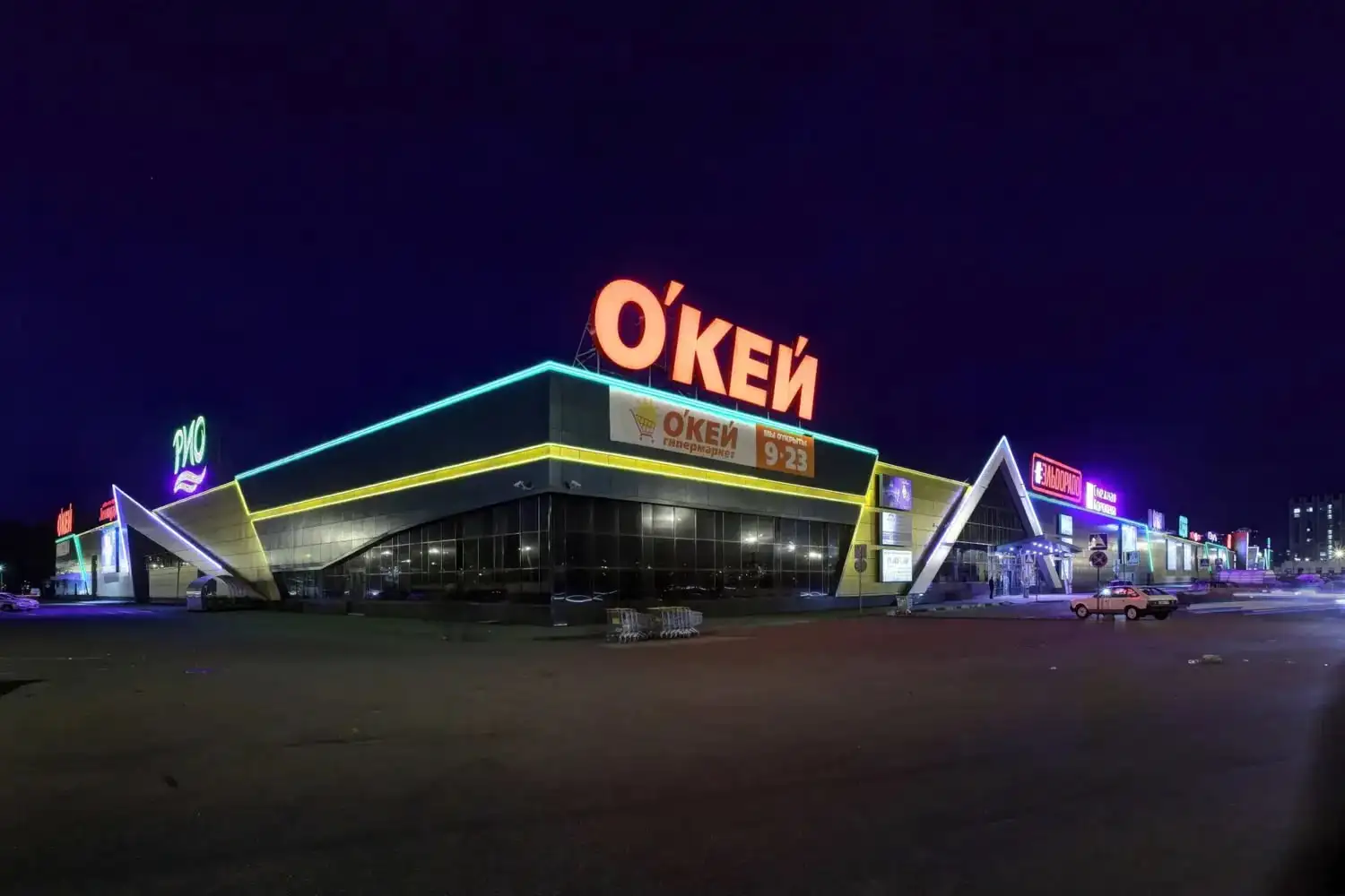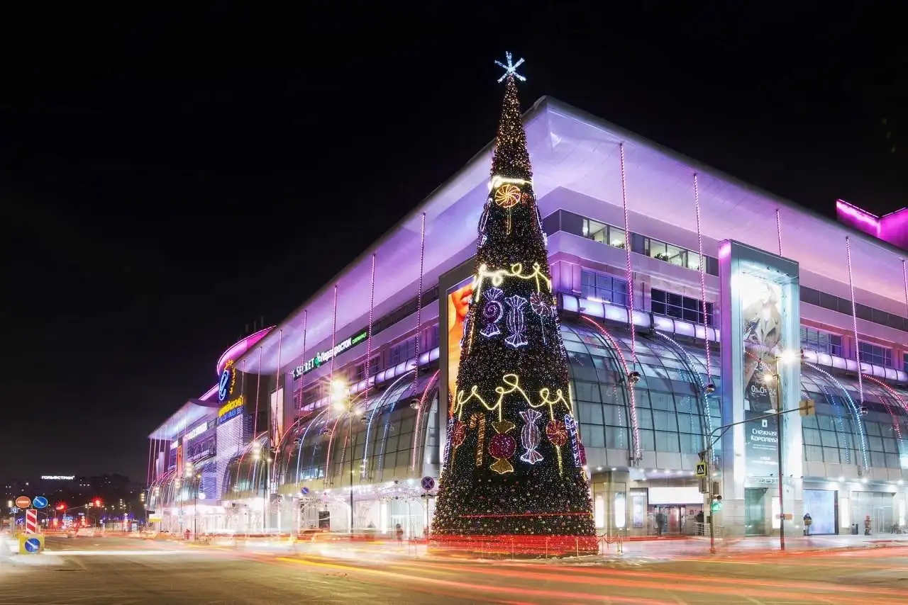 Компания LS illumination украсила ТРЦ «Времена года», создав яркое праздничное оформление фасада к Новому году.
